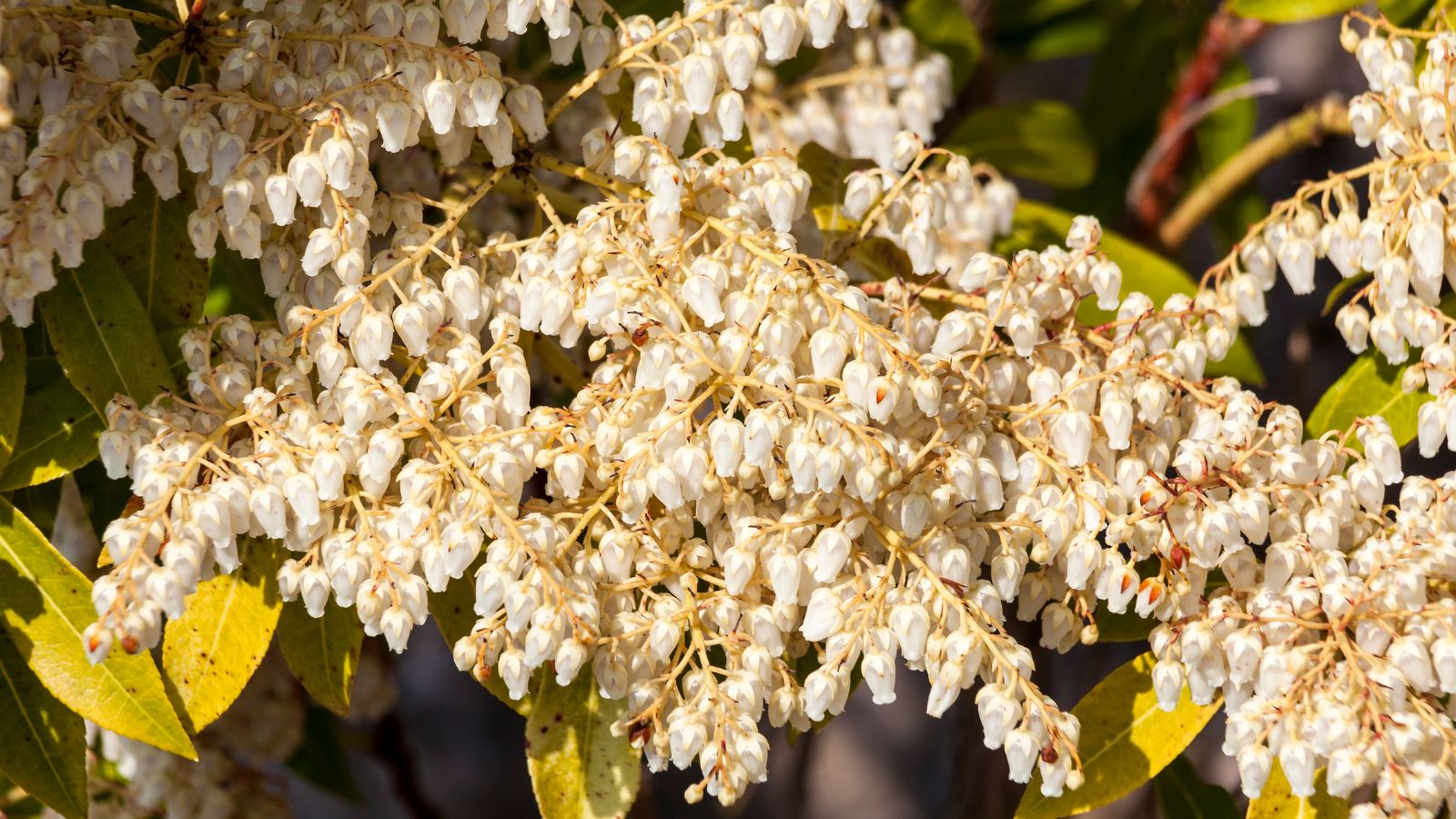 A differenza delle precedenti, il Pieris è un arbusto sempreverde che dona volume e struttura al giardino di fine inverno. Schiude boccioli rossi che si aprono in grappoli di fiori candidi o rosati, simili a mughetti.